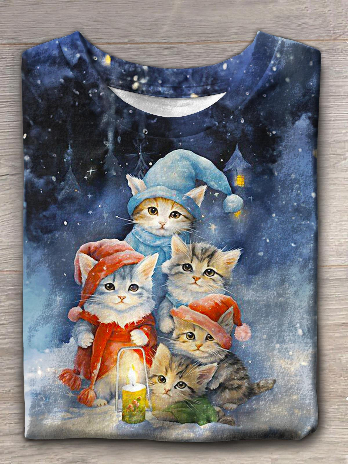 Women's Winter Cute Cat Print Crew Neck T-shirt